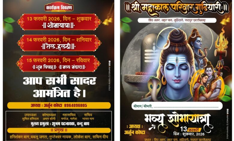 रायपुर। श्री महाकाल परिवार गुड़ियारी की ओर से एक भव्य शोभायात्रा का आयोजन किया जा रहा है। इस धार्मिक आयोजन में क्षेत्र के सभी सनातनी श्रद्धालुओं को सादर आमंत्रित किया गया है। यह शोभायात्रा 13 फरवरी 2026, दिन शाम 4:00 बजे निकाली जाएगी। यात्रा का शुभारंभ शिवनगर नहर पारा, गुड़ियारी से किया जाएगा।